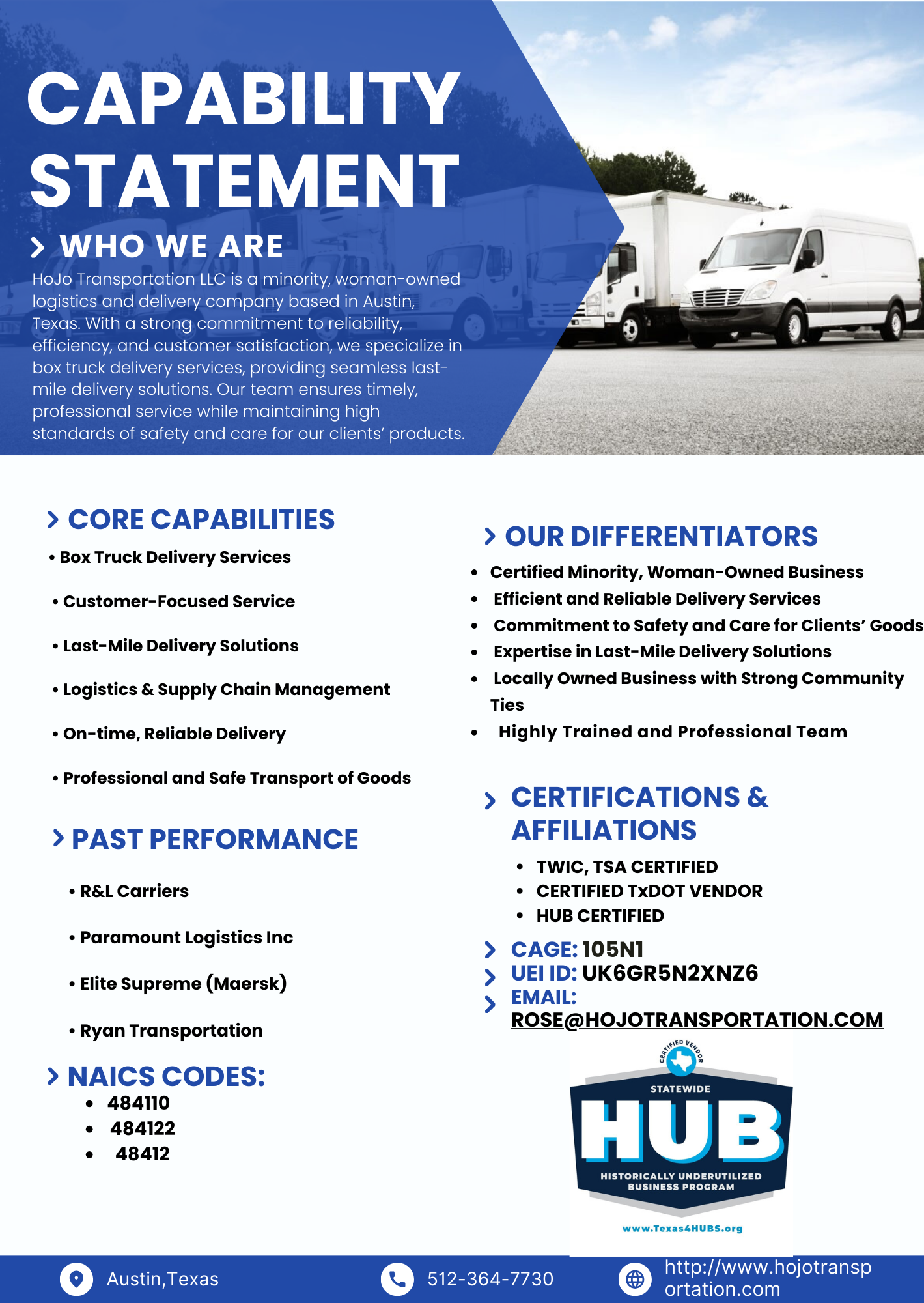 Based in Austin, Texas, Hojo Transportation is a minority and woman-owned business specializing in final mile carrier services. As a TXDOT-approved vendor, we offer efficient, secure, and timely transportation solutions for businesses of all sizes.